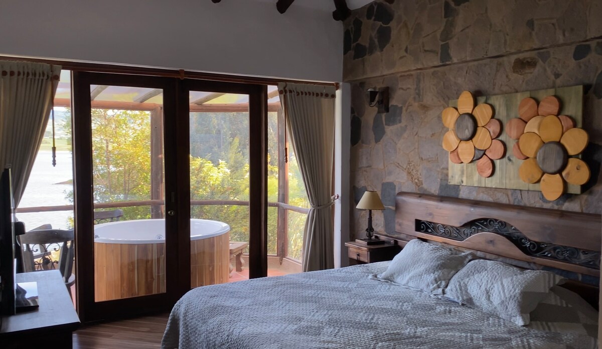 這個地方提供無與倫比的景觀,讓您享受大自然。 距離Toca 10分鐘,距離Tunj 35分鐘。 它有3間舒適的房間、3間浴室和公共區域,配有壁爐,可供家庭享用,俯瞰大壩,直達水邊。 房客可以放鬆身心,享受按摩浴缸、土耳其浴、撞球桌、烤肉、營火、棋盤遊戲、皮艇和健行。 如有需要,還可提供其他服務(水上運動和沿水壩的遊船之旅)。