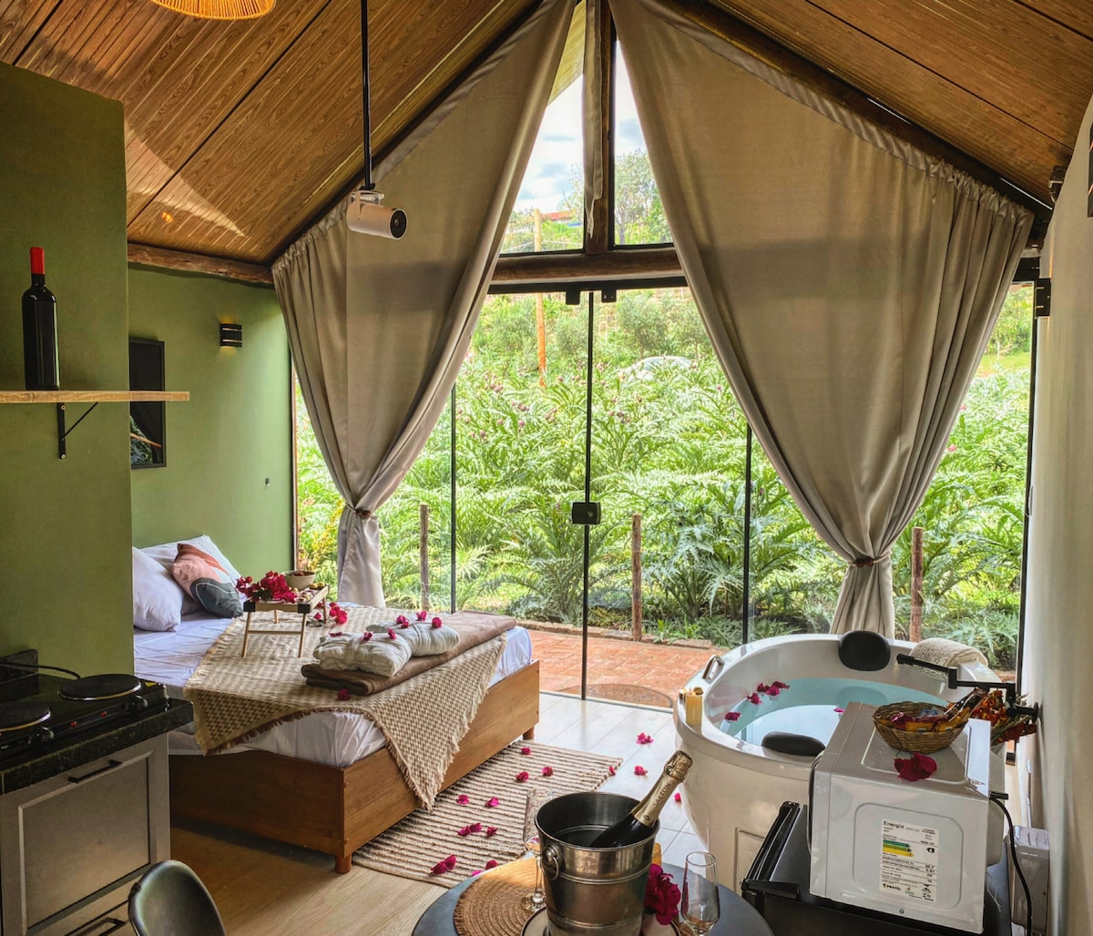 想要享受獨特的住宿體驗嗎?在Cabana Rústica,每一個細節都經過精心設計,讓您與伴侶擁有難忘的體驗。 - 全景窗戶 - 石湖; - 航海吊床和休息吊床 - 室外壁爐 - 皇后尺寸床 -智慧電視 -空調 -藍牙音響 - 帶全景天花板的浴室 -浴缸 -整合式廚房 - 高速 Wi-Fi。