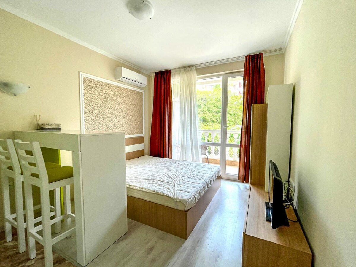舒適的單間公寓,配有Wi-Fi和空調! 🌴 公寓提供Wi-Fi、空調、2間餐廳、2間商店,以及17個戶外泳池的花園。 這個區域非常適合在Stara Planina山脈徒步旅行、潛水或迷你高爾夫球。 室內有有線電視和Netflix。 小廚房包括微波爐、冰箱、烤麵包機、水壺和咖啡機,浴室有洗衣機和吹風機。