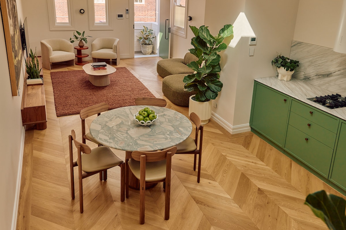 精品酒店感覺,有家的舒適,最多可供5人入住。 復古風格,位於Newtown中心,提供免費安全停車位。 公寓空間寬敞,配有雙層玻璃窗,可隔絕噪音。共有 2 層;2 張標準雙人床、1 間臥室和 1 張閣樓兒童床。 這間陽光充足的公寓配有全長窗簾、舒適的床鋪和家具。 探索雪梨的中心基地,距離紐鎮火車站5分鐘路程。 餐廳、Enmore劇院、酒吧、復古商店和咖啡館就在門口。 全功能廚房、獨立衛浴,配備洗衣機。