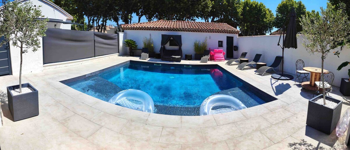 Welcome to our private oasis for 1 or 2 people in the heart of la roquette! Enjoy the heated salt water pool surrounded by tropical plants. The space will offer you a haven of shade and tranquility. Have breakfast, an aperitif, or cook poolside in the outdoor patio kitchen. The bedroom is air conditioned and equipped with luxury hotel quality bedding and organic linens, to ensure that your stay is relaxing and memorable.