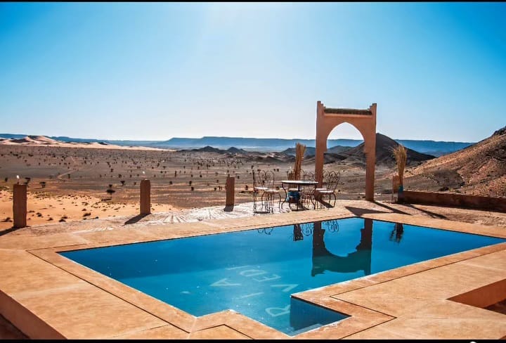 歡迎來到我們坐落在Ouzina沙漠中心的真實沙漠摩洛哥傳統庭院,這是一個隱藏的寶石,寧靜、星星和沙灘創造了一個難忘的度假勝地。 我們的摩洛哥傳統庭院四周環繞著金色沙丘和廣闊的開闊景觀,提供遠離人羣的寧靜度假勝地。 它以傳統的摩洛哥風格建造,結合了鄉村魅力和舒適性,擁有舒適的房間、溫暖的大地色調和反映沙漠精神的手工細節。
