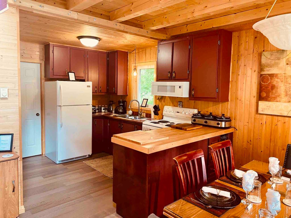 La cabine est située dans une forêt dense de cèdres et vous offre une expérience glamping unique. Capacité 2 personnes. La cuisinette est toute équipée et vous dormirez dans un confortable lit queen avec couette. Toilette au composte dans l'unité et accès au bloc sanitaire pour profiter de salle de bains complètes privées ainsi que pour l'approvisionnement en eau. Stationnement à quelques mètres du sentier d'accès et de la cabine. Nous sommes situés à 20 minutes de Carleton-sur-Mer.