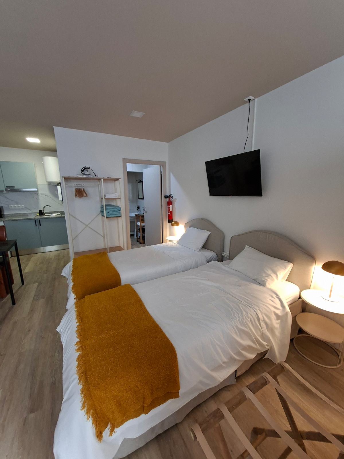 Localizado no centro da cidade, equipado para pequenas refeições, wc privado, 2 camas individuais , tv, sofá, ambiente acolhedor e tranquilo.