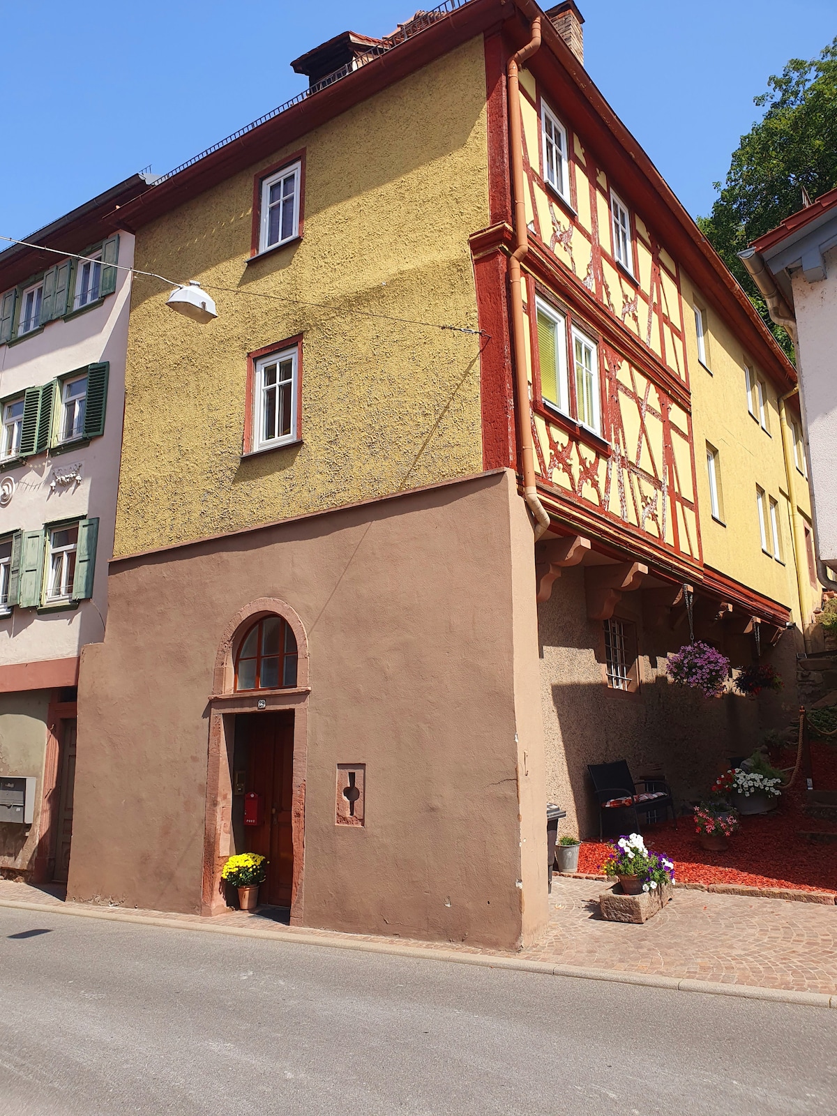 明亮的120平方公尺一樓公寓,配備高級設備 免鑰匙 空調 ・室內壁爐 硬木地板 廚房設備齊全 2台全自動咖啡機 XXL床200x200電動 XXL 起居區,配有床功能 自動百葉窗 日光浴室 100 Mbit 網路 保險箱 設有戶外廚房的露臺 在Marktheidenfeld郊區 距離主路/自行車道200公尺 Wallbox充電選項高達22 kW € 0.49/kW 山地自行車租賃每輛自行車/每天10歐元