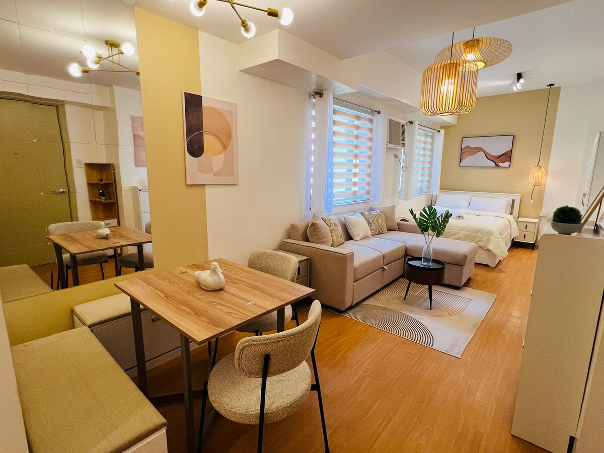 歡迎來到Eton Emerald Lofts的CIRQ Studio。這間全新的40平方公尺閣樓式公寓位於奧爾蒂加斯商業區的中心,步行僅需4分鐘即可抵達Robinsons Galleria。這間公寓的主題和靈感是Japandi現代酒店豪華風格,配有中世紀現代家具和裝飾。中性色調,結合深色木質紋理,鈦藍色和金色裝飾,使公寓的每個角落都適合拍照上傳到Insta-gram。:)