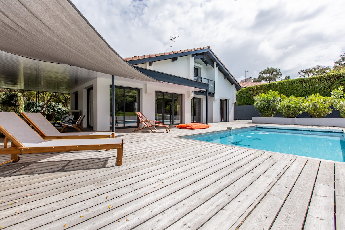 Sabaou 別墅,高級豪華,配備溫水泳池、逆流游泳設施、水療中心、無對面建築、空調、明亮、風水設計、景觀花園,位於布勞 (Braou) 寧靜區域,非常靠近比亞里茨 (Biarritz) 市中心和海灘。 別墅(202 平方公尺)有 4 間臥室(其中 2 間為套房)、1 間浴室、2 間淋浴間、1 間配備鋼琴的大客廳、65 吋電視、壁爐、設備齊全的廚房、1 個儲藏室、1 間辦公室、2 個大型遮蔭露臺、2 個私人停車位、獨立出入口。