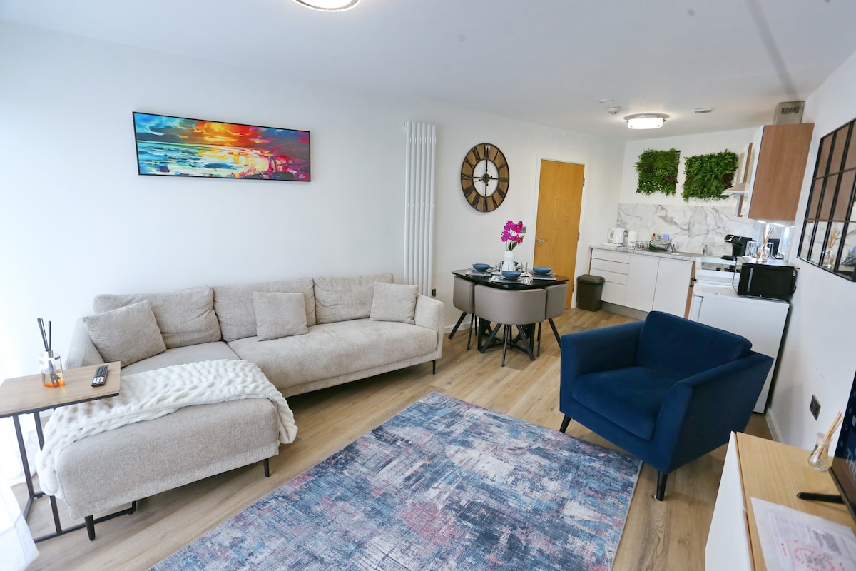 時尚的一臥室公寓,門外的私人停車區域有22kw電動車充電器! 它提供舒適的住宿,可供2/4位房客入住,配有加大雙人床(或兩張單人床),提供靈活的睡眠安排,客廳區域還有一張沙發床。 位置便利,對面有咖啡店-非常適合早餐-步行即可抵達商店和餐廳。我們接受最多2隻狗,每隻狗每次住宿收費20英鎊,需支付給房東。