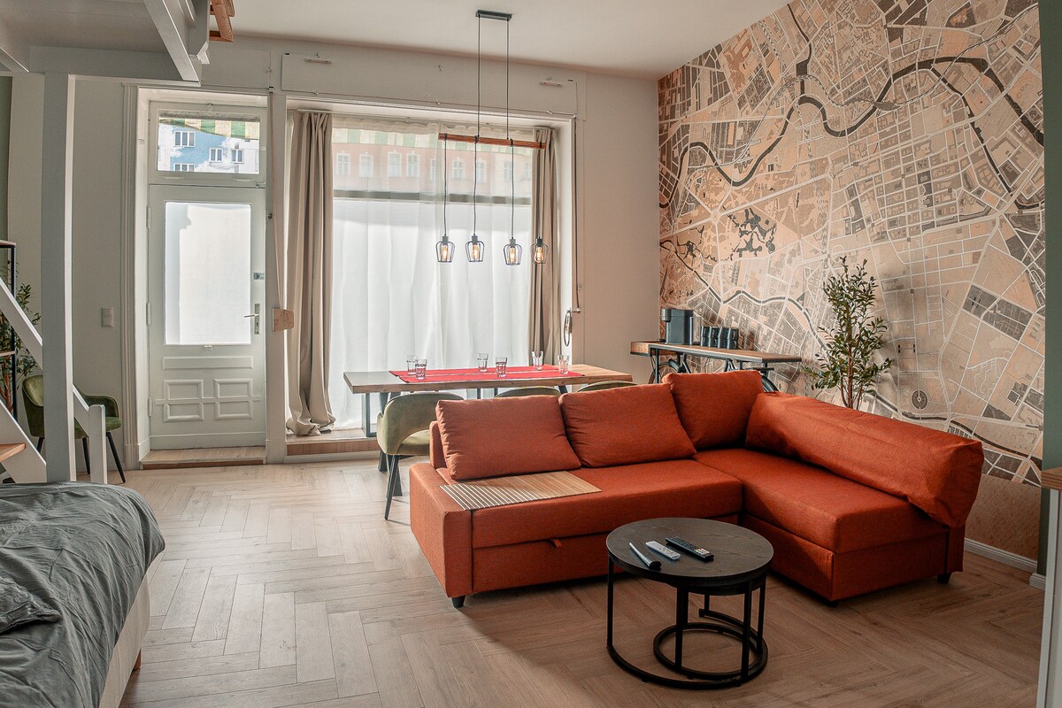 Stay in a bright and spacious designer loft in the heart of Prague. The apartment combines industrial details with Scandinavian minimalism, creating a warm and unique atmosphere. ● 3 minutes to the tram stop from the house ● 6 minutes by tram from the city centre (Wenceslas Square) ● Smart TV ● Capsule coffee machine ● Cleanliness is our priority № 1 ● Modern kitchenette with extended work area ● Washing machine ● Dishwasher ● Wi-Fi