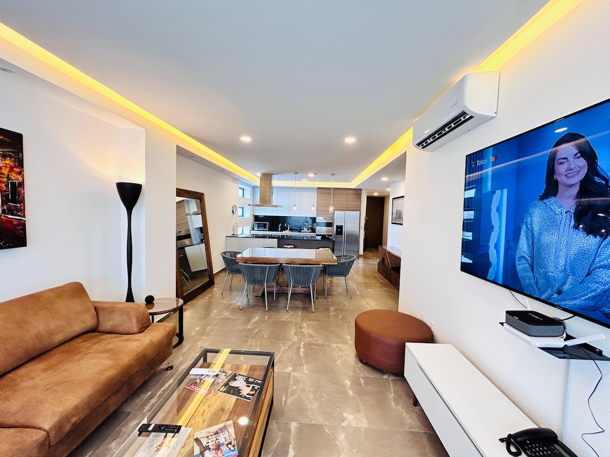 享受這間位於市中心且舒適的住宿。實用的電子鎖。可容納5人,有2個寬敞的停車位。我們有 2 間臥室:主臥室配有加大雙人床、獨立浴室和陽臺,次臥室配有雙人床(兩間臥室均配有智慧電視和大衣櫃)。客廳配有陽臺和沙發床。全套廚房,配備烹飪/加熱食物所需的一切。設施(按摩浴缸、健身房、露臺和客廳)。休息、共處和享受!