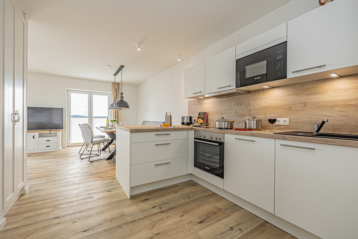 位於維京塔樓10樓的公寓,維京塔樓層,可俯瞰波羅的海峽灣的壯麗全景。從陽台上,窗戶可以向一側推開,您可以看到市中心和大教堂、城市港口、海鷗島和施萊海峽。從客廳也可以欣賞到美麗的景色。非常適合從這裡探索石勒蘇益格及其周邊地區。 可在停車場或房東的物業(Schwanenwinkel 1)停車。