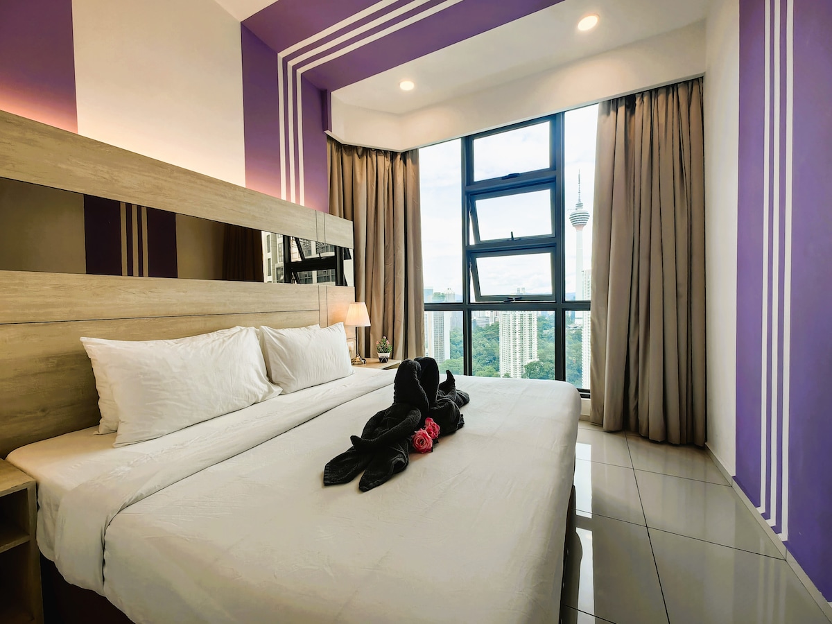 位於吉隆坡市中心,靠近BBKLCC購物街。 亭子; 15分鐘即可抵達吉隆坡城中城雙子塔和吉隆坡塔;步行即可抵達阿羅、唐人街、中央市場和章卡武吉免登( Changkat Bukit Bintang ) ;乘坐輕鐵和單軌列車即可抵達。 這間套房採用現代化的新行政風格,木質色調和金色,可欣賞吉隆坡天際線景觀。 此房源配有24小時輕鬆自助入住、24小時保安、5星級設施-無邊際泳池、健身房、吉隆坡城中城景觀的天空按摩浴缸泳池、迷你高爾夫球場等。