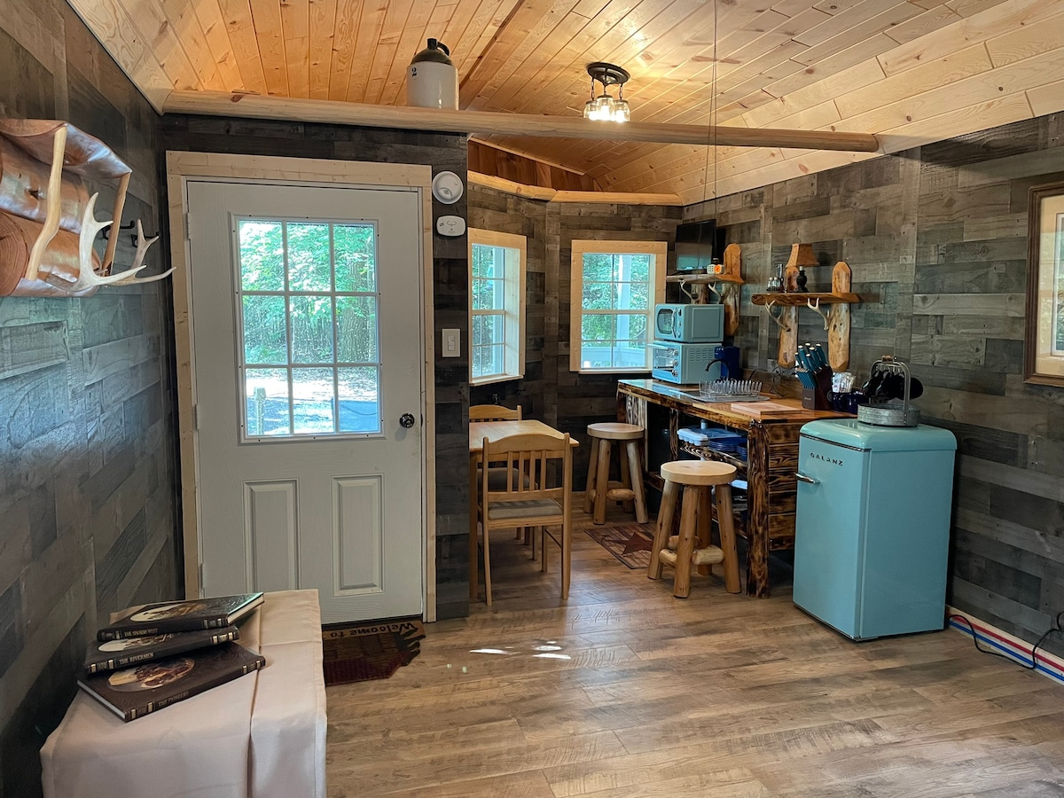 This 350 sqft Tiny Cabin is walking distance to Meadows trail head in Luzerne. One block east of the famous Ma Deeters Restaurant. This clean & cozy cabin is a perfect place to relax between enjoying the trails, rivers & local Amish shops. One queen size bed in the loft and a full-size pull out sofa sleeper. 4 seasons firepit out back. A propane grill is also available in the firepit area. Perfect for couples getaway, small family fun, or a boys' weekend away! Message us anytime! :)