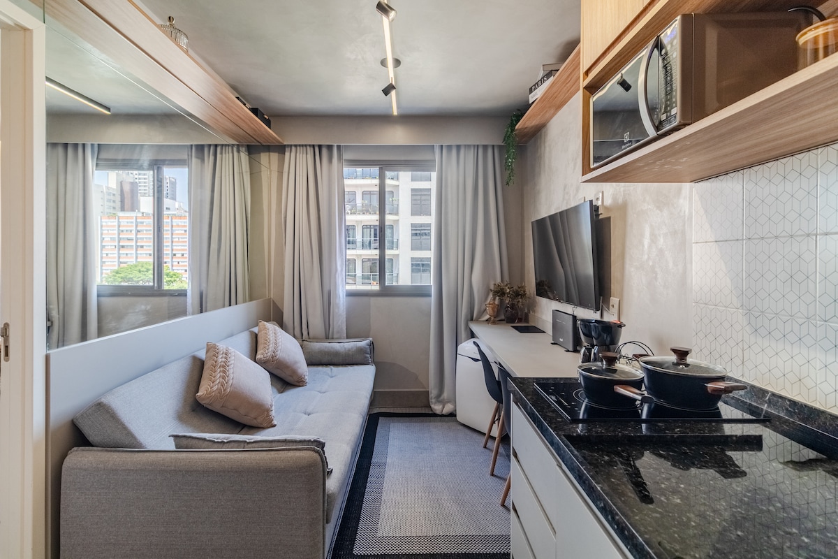 這間全新的單間公寓位於市中心的文化中心,有博物館、電影院和商店,距離Rua Augusta僅兩個街區,距離Av僅幾分鐘路程。 Paulista ,聖保羅最好的夜生活和美食地區。 快速可靠的WiFi 交通方便,步行5分鐘即可到達Paulista、Consolação和Higienópolis/Mackenzie地鐵站。 大樓有完整的24小時健身房和洗衣設施。 1輛車的免費停車位。 100英寸電影螢幕,可收看Netflix和Prime影片。