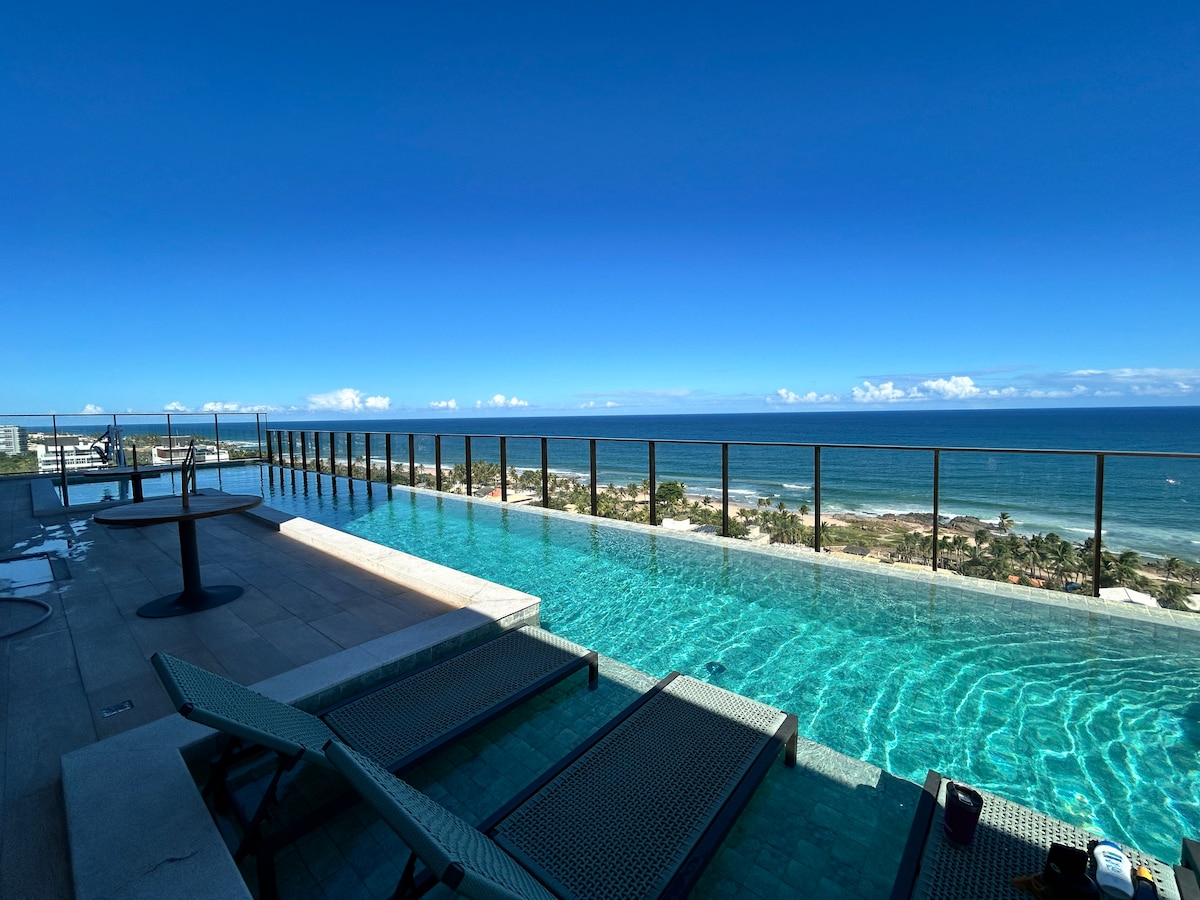 Venha relaxar nesse studio à beira mar! Piscina na cobertura (rooftop), com vista mar, garagem e portaria 24h. A 10 min. do aeroporto de carro, perto de mercadinhos, da famosa Barraca do Loro e do restaurante Casa di Vina, onde morou o poeta Vinícius de Morais. A apenas 3 min. da praia, a 7 min. do Farol de Itapuã andando, a 150m do centro de convenções do Hotel Deville e com ponto de ônibus em frente ao edifício. Seja muito bem-vindo!