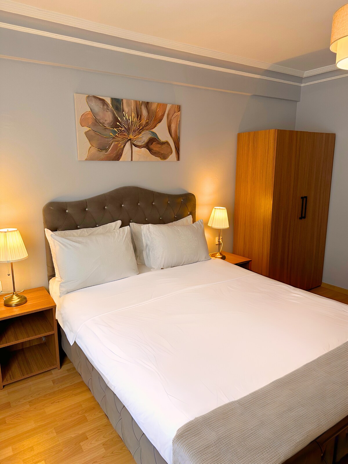 這間寬敞的單間公寓提供一張雙人牀和寬敞的起居區域。 起居區有一張大沙發牀,可作為額外房客的牀。 單間公寓提供私人小廚房和帶中型按摩浴缸( 140釐米* 80釐米)的獨立衛生間。 有24小時門房,每2天有一次客房服務。 土耳其浴室需要在抵達時預訂免費入住。 此外,我的房客將在餐廳獲得% 10折扣,請提及您是Yusuf的房客:)