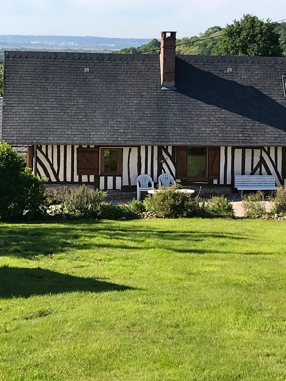 Nous vous accueillons dans notre chalet en bois sur la côte normande près d’Honfleur. L’entrée d’Honfleur, du pont de Normandie et du village des marques NORMANDY OUTLET sont à 7 minutes en voiture. Vous trouverez le repos dans un cadre privilégié à la campagne sur un terrain de 5000M2 fleuri avec ses arbres fruitiers à votre disposition. Le chalet est entièrement équipé, avec plaque de cuisson, four encastré, micro-ondes, réfrigérateur, cafetière, grille-pain et écran LED. Bon séjour à vous !