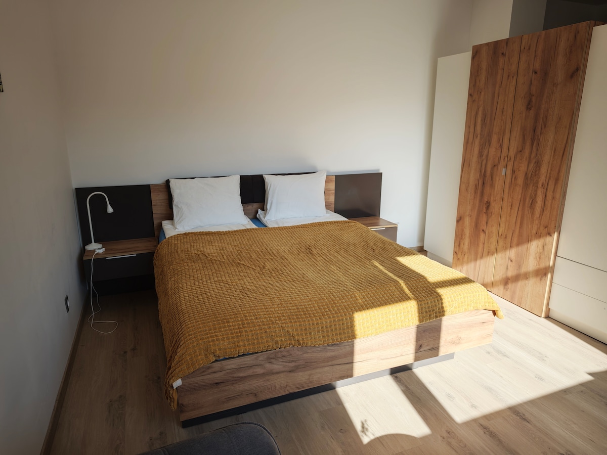 在翻新的公寓中,感覺像在友好的社區中。距離市中心僅幾分鐘路程。 50 平方公尺的公寓配有一張加大雙人床,也可以分成兩張床、額外的沙發床、Nespresso 咖啡機、收音機、電爐、配有 Netflix 的智慧電視、大冰箱、快速網路 WiFi、陽臺和免費停車位。