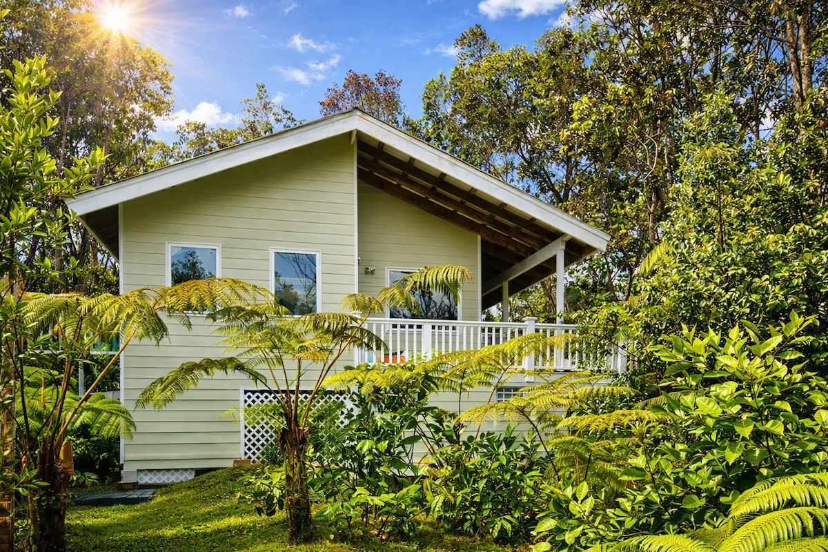 Ideal for Volcanoes National Park explorers, this artistic retreat offers a blend of comfort and Hawaiian charm. Immerse yourself in original artwork and island decor. This impeccably clean tranquil rainforest vacation home has 2 bedrooms , 1 bath , a fully equipped kitchen, and a spacious lanai to enjoy your coffee in the morning with private yard. Only 5 minutes from the park and village restaurants, enjoy family relaxation or remote work. Complete with coffee, tea, high-speed WiFi.