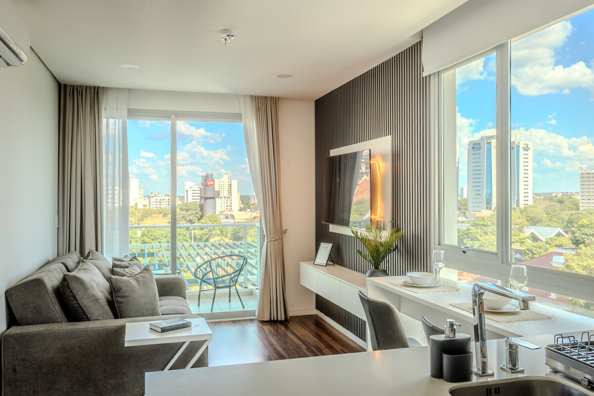 從這間位於 6 樓的現代單間公寓欣賞亞松森,配有標準雙人床和大陽臺,景觀令人驚嘆。 在沙發上放鬆身心,配備電視,在設備齊全的廚房輕鬆烹飪,並充分利用大樓的設施:全景泳池、烤架、SUM、健身房和洗衣房。 非常適合尋找舒適、位置和風格的情侶或旅客,適合短期或中等住宿。