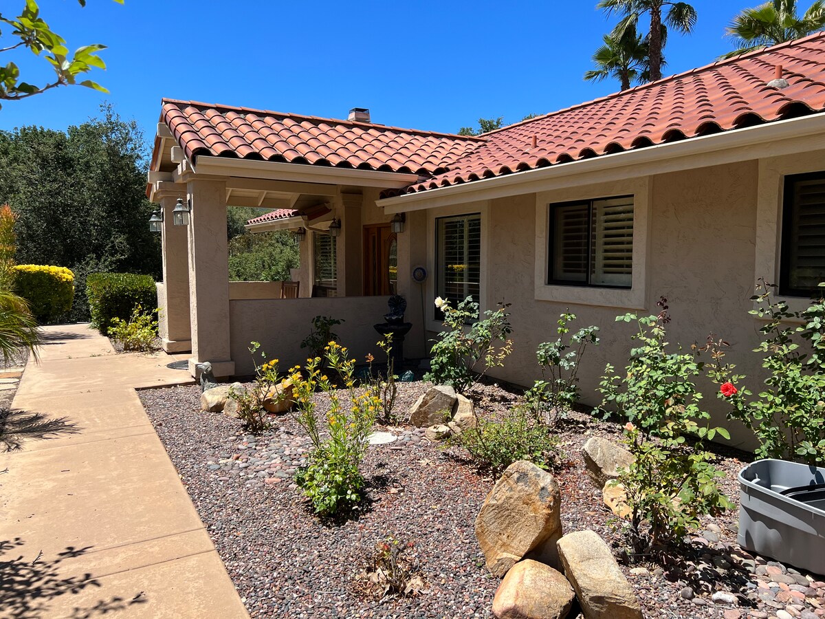 Ramona的Dell提供一間4間臥室2 1/2浴室單層房屋,配有兩個火坑的露臺、游泳水療/按摩浴缸,以及最安靜、寧靜的地方欣賞日落。我們已準備好處理您的下一個活動,無論是什麼活動,我們還提供與房子相連的太平洋客房,最多可容納6人。非常適合想聚在一起品酒、徒步旅行或參觀古董商店的女孩週末或情侶。
