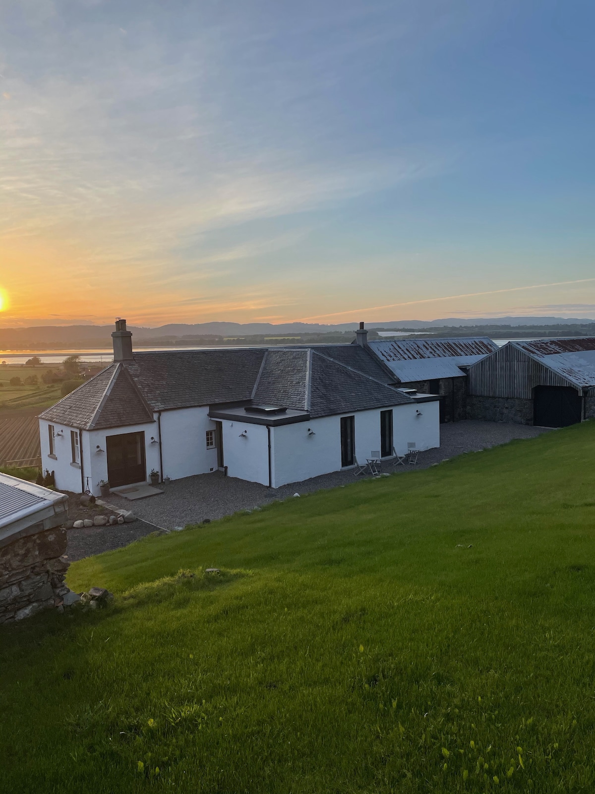 Enjoy stunning views over the River Tay from a luxury countryside base (35 mins to St Andrews & 50 mins to Edinburgh). Old Parkhill at Hyrneside is a beautifully restored 3 bed farm cottage, featuring a stylish open plan space, designer kitchen, wood stove and heated polished concrete floors. Relax in marble washrooms, one with a clawfoot bath, the other a walk-in shower. French doors open out to a courtyard dining area + pizza oven, fire pit and acres of farmland, forest + trails to explore.