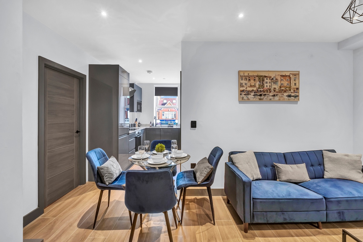 Stylish 2-bed, 1-bath luxury apartment in North Finchley (N12). Sleeps up to 5 with a sofa bed, modern open-plan living, and premium kitchen.