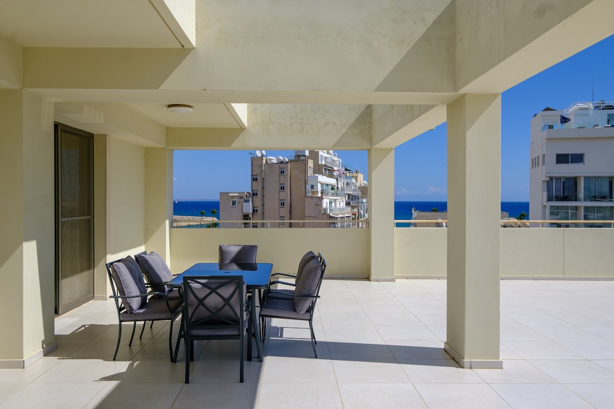 海景公寓,距離水域僅幾公尺。黃金地段,無需開車。  位於拉納卡最理想的旅遊景點的中心。這間海濱公寓提供一覽無遺的海景,距離海邊僅幾公尺,您可以在海浪聲中放鬆身心,欣賞美景。  坐落在海邊步行道旁,該步道連接著名的Finikoudes街區和Makenzy。  全面翻新,簡單美麗的公寓。