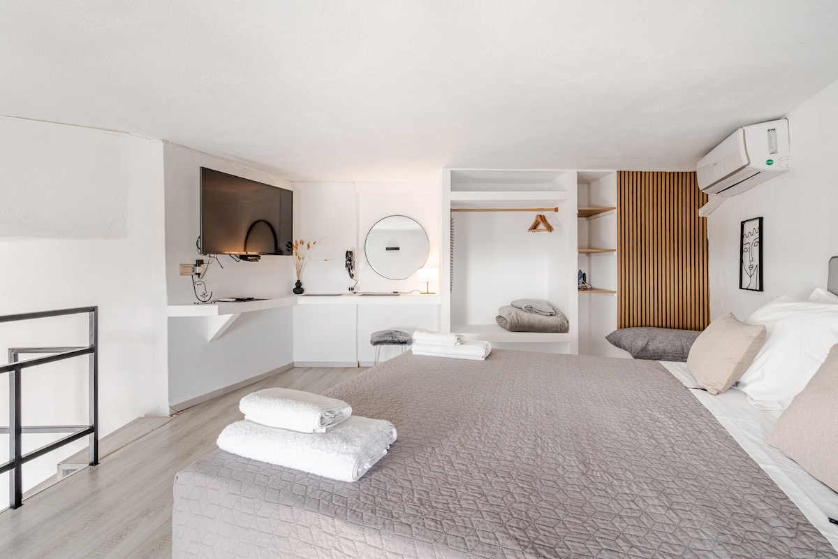 Mirabo Villa’s homonymous suite built in maisonette style has two different leveled bedrooms with double beds making it ideal for families, group of friends and honeymooners who want to enjoy their holidays in a very comfortable and relaxing way. The two separate and spacious bathrooms are beautifully styled and the living room offers hours of relaxation . On the second floor, you can enjoy the caldera & volcano views and the sunset from the private balcony.