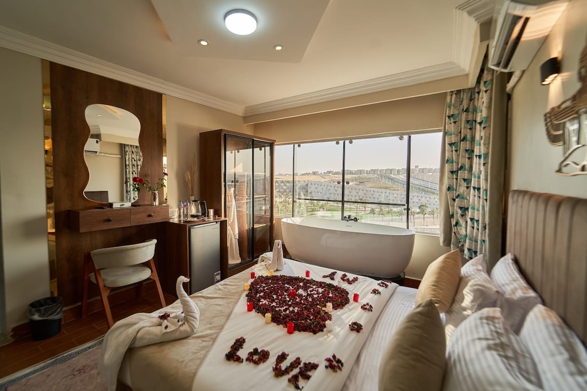享受獨立房間,配有舒適的大床和吉薩金字塔的迷人全景。 我們友善的五星級服務提供 24 小時全天候服務,確保您輕鬆、順暢和難忘的住宿體驗。