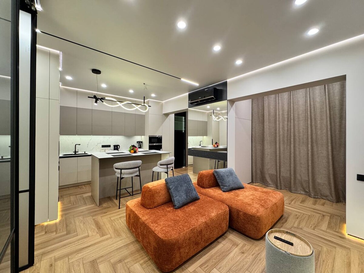 時尚、寬敞的雙臥室公寓,面積55平方公尺。設計師翻修。 一切都經過精心設計。 美麗的臥室,配有大牀、配有咖啡桌的沙發和時尚的山景。 客廳配有大型折疊沙發和智慧電視。 廚房區域,配備您所需的一切。 高速網路。兩間隔離的浴室和一個淋浴。 無鑰匙通道。24小時保安。 舒適安靜的院子。位於城市最現代化的區域。 步行2分鐘內即可抵達最近的購物中心。