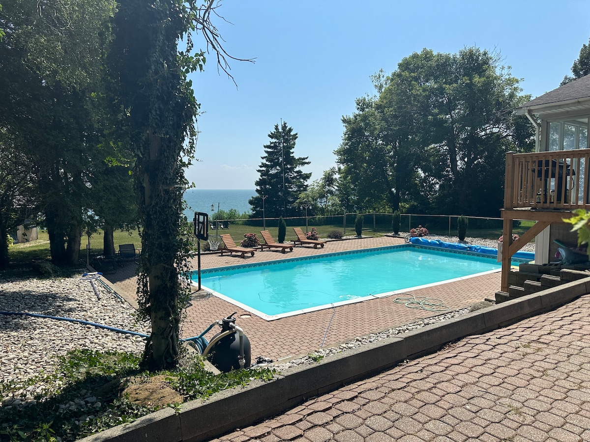 位於7400平方英尺豪宅地下室的寬敞開放式套房。私人入口,可使用泳池和戶外用餐區,配有野餐桌。 享受精美的修剪場地,步行路徑,並與我們的羊駝打招呼,您可以與他們互動。 隔壁是75英畝的皇家土地,有美麗的自然步道,您可以在那裡享受觀鳥和徒步旅行。距離Ridgetown和Thamesville僅5分鐘!
