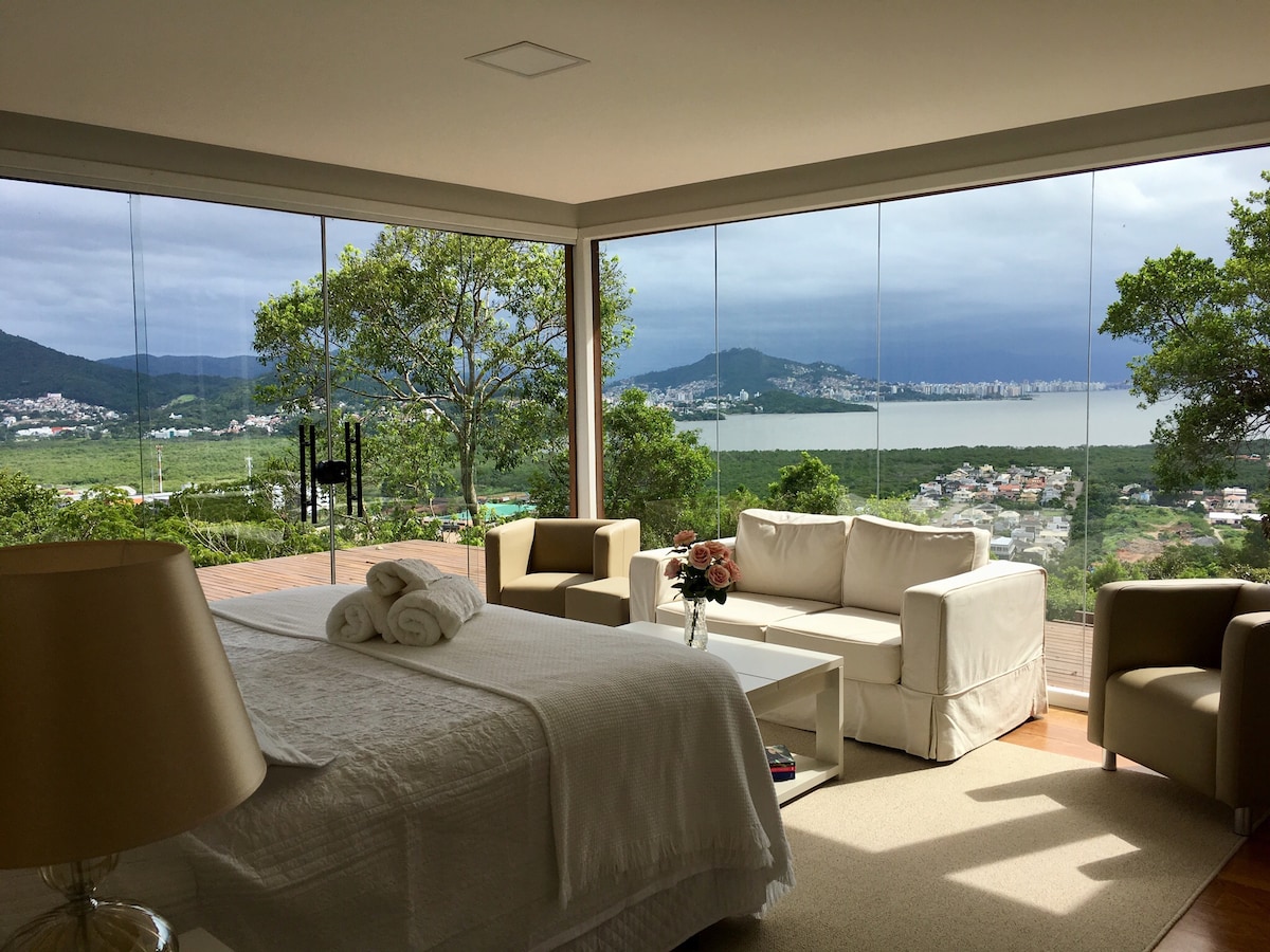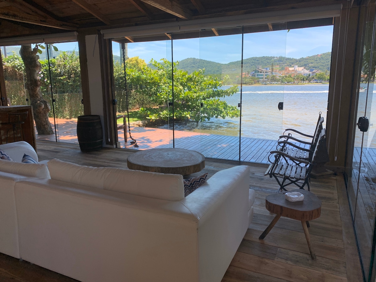 美麗的房子,有兩間套房,面向湖泊,距離市中心300公尺。這座房子最近用拆除的木材和玻璃建造而成,與美麗的景觀融為一體。我們提供2個立式泳池,您可以在房子前面的甲板上進行運動。配有全套高級廚房和高品質的家具。您可以在弗洛里亞諾波利斯最受歡迎的地方之一放鬆身心,享受私人海灘!!注意:我們不使用社交網絡提供此房源
