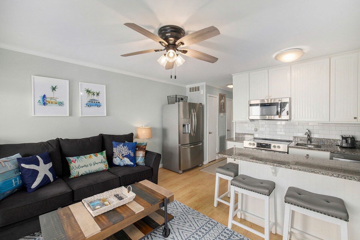 One bedroom condo on Charleston's closest beach! 15 minutes from downtown Charleston and 500 steps to the ocean. The City of Folly Beach has many pet friendly restaurants, a dog park, and dogs are allowed on the beach from October through April. There is a king size deluxe bed in main bedroom, as well as a queen pullout sofa and two accent chairs in living room. There is a 50" smart TV in living room. Kitchenette with dishwasher. Access to washer/dryer on suite (shared with one neighbor).