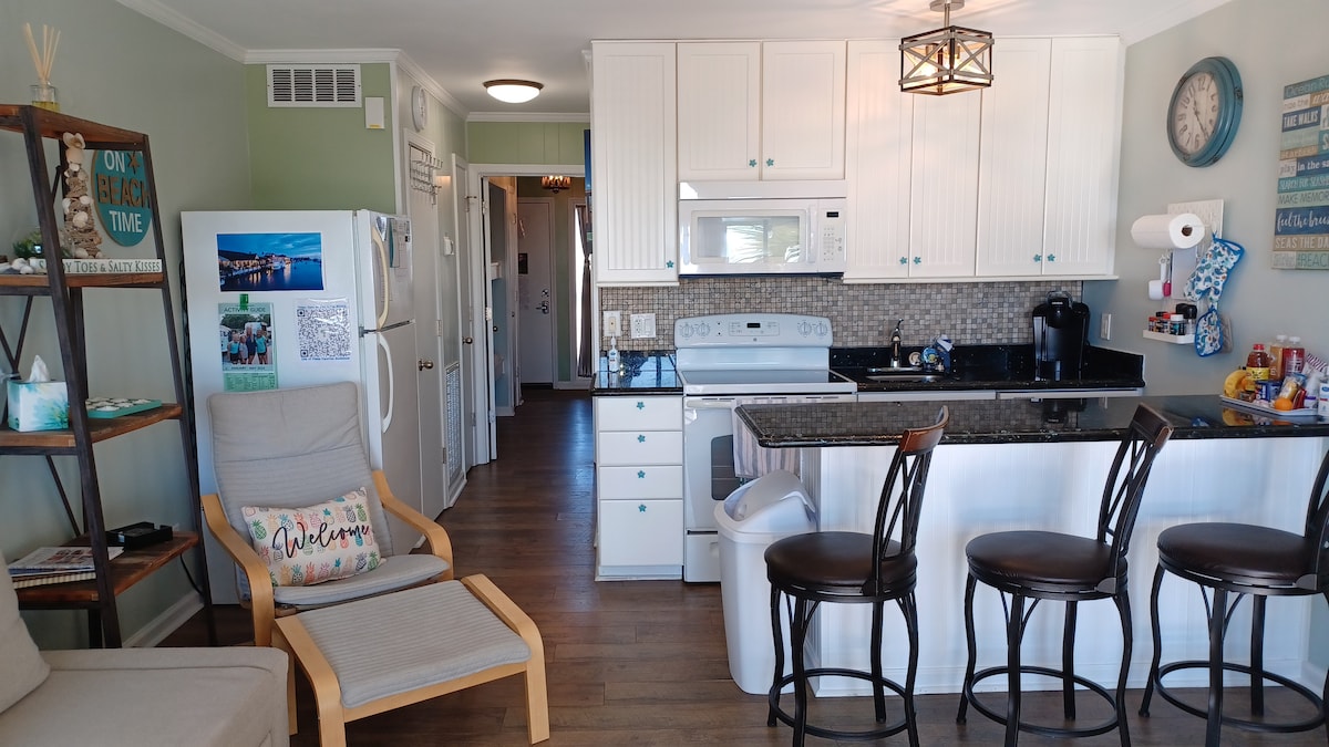 One bedroom condo on Charleston's closest beach! 15 minutes from downtown Charleston and 500 steps to the ocean. The City of Folly Beach has many pet friendly restaurants, a dog park, and dogs are allowed on the beach from October through April. There is a king size deluxe bed in main bedroom, as well as a queen pullout sofa and two accent chairs in living room. There is a 50" smart TV in living room. Kitchenette with dishwasher. Access to washer/dryer on suite (shared with one neighbor).