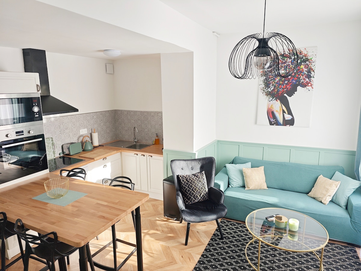 Ce logement familial en centre ville, d'un peu plus de 70m2, est proche de tous les sites et commodités. Très lumineux et paisible, il a été entièrement rénové et équipé de mobilier neuf, très confortable, attention aux détails; Au rez-de-chaussée, vous trouverez un grand toilette avec lave-mains, une cuisine ouverte équipée et un salon / salle à manger. A l'étage, vous trouverez ensuite une grande salle de bain avec baignoire et toilette ainsi que deux chambres. Une double et une double simple.