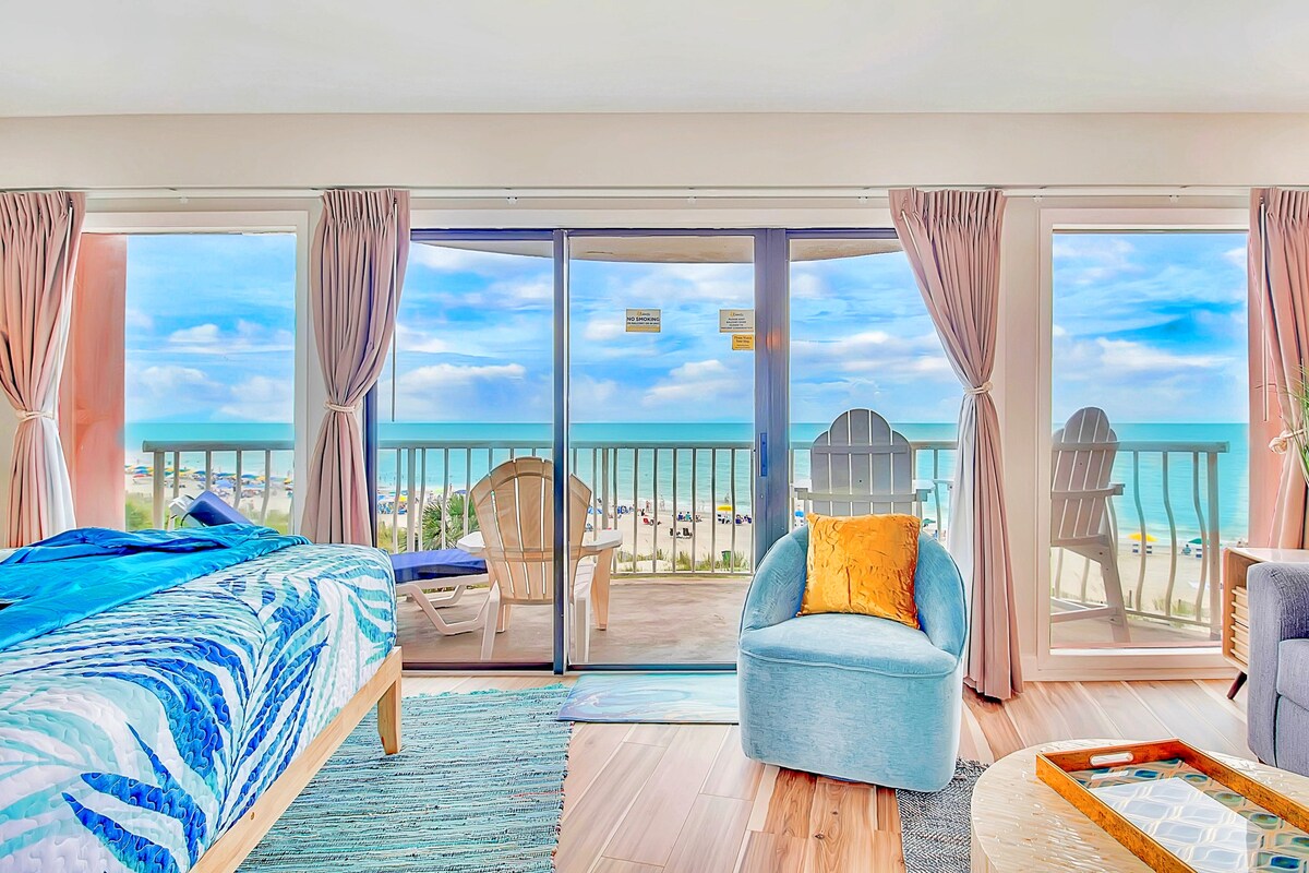 Wake up oceanfront in this 11th-floor king studio at Caravelle Resort on Myrtle Beach’s Golden Mile. Designed for couples who want easy beach access without extra space, Simply SUNsational features a king bed, a well-equipped kitchen, and a private balcony overlooking the Atlantic Ocean for morning coffee or evening views. Enjoy all our resort amenities and see why this condo continues to be a couple's favorite.