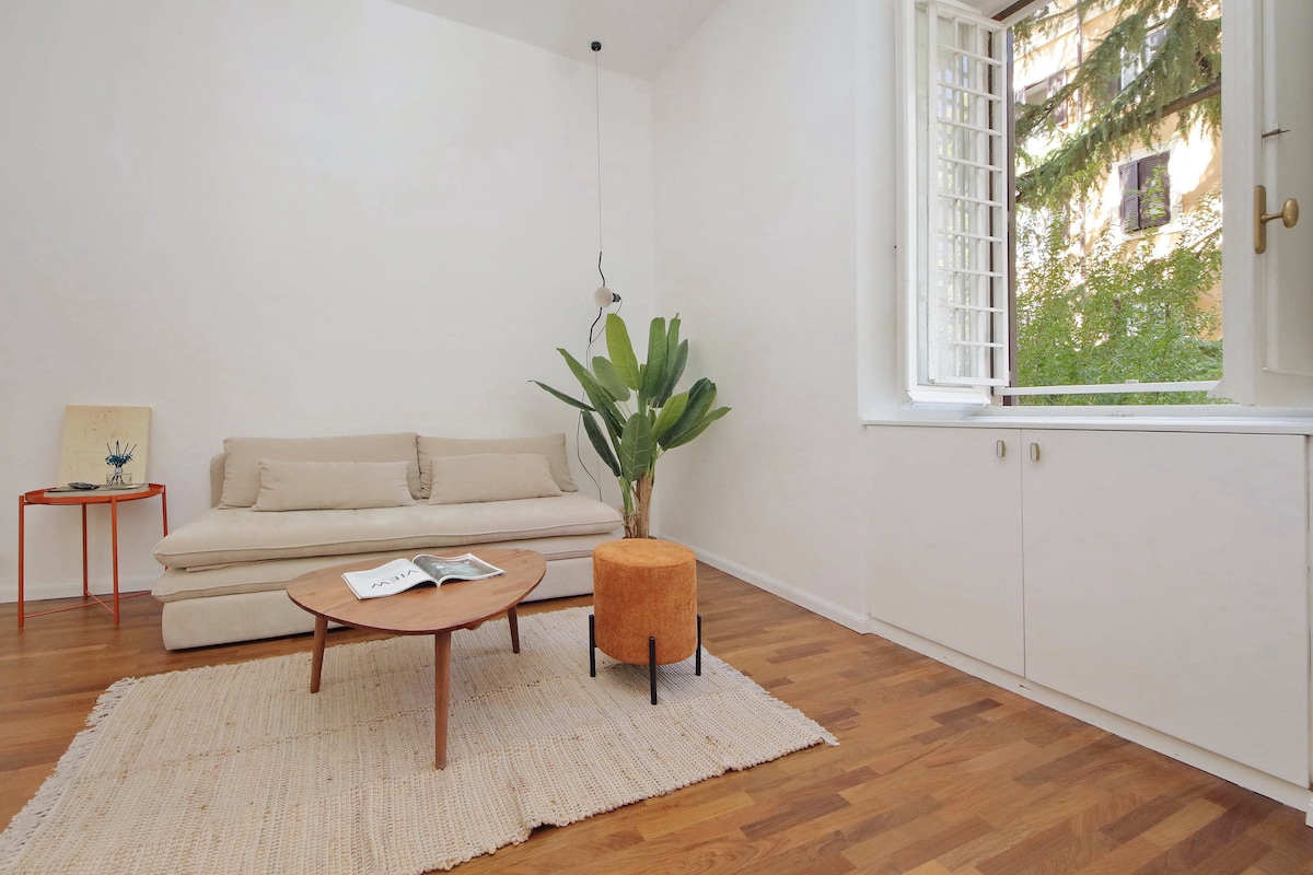 In the heart of the Prati district, within walking distance of the Vatican, this romantic and bright Donna Ilaria studio is located on the 6th floor (with elevator) of an elegant early 20th-century building designed by the famous architect Marcello Piacentini. Just minutes from the Stadio Olimpico, it’s also the perfect choice for guests attending football matches, the Internazionali BNL d’Italia, or major concerts — allowing you to enjoy the event and comfortably walk back home.