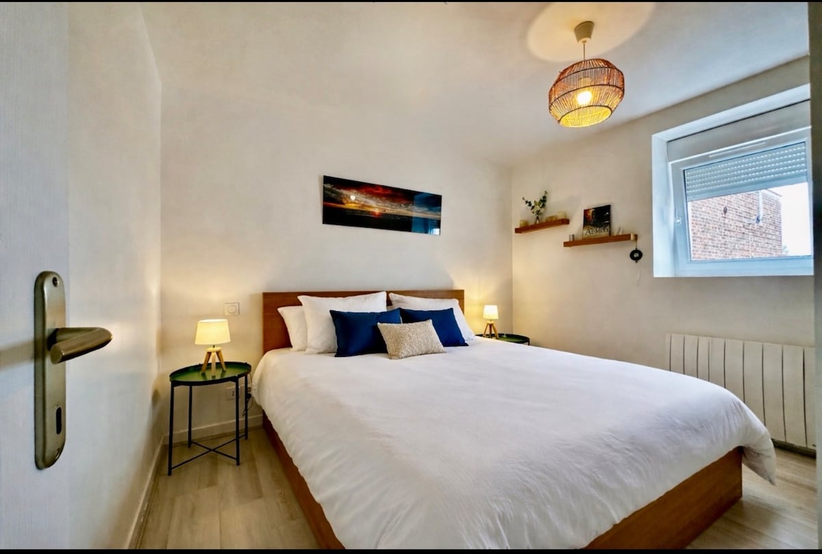 在這個寧靜的海濱住宿度過舒適的週末。我的 24 平方公尺單間公寓距離 Fort-Mahon 海灘 50 公尺,非常適合情侶入住。您會喜歡它靠近商店、許多餐廳和私人停車位。 提供床單和盥洗用品(毛巾、手套、浴室地墊)。 單間公寓經過全面翻新,隔音效果良好。