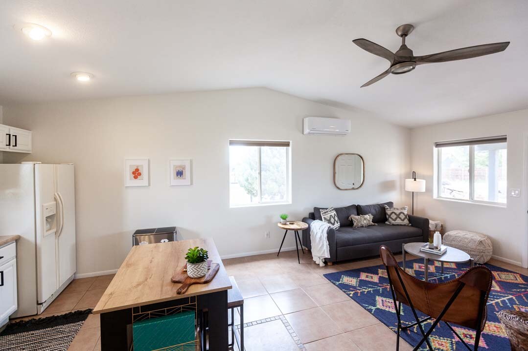 This delightful cottage is located on the west side of Flagstaff, 3 mi from downtown Flagstaff, and 2.5 mi from NAU’s main campus. The one-bedroom / one-bath cottage is a newer build with a great front patio, small backyard area, private garage, and driveway. Conveniently located across the street from a park area with Basketball courts, and a picnic area, it is adjacent to a trailhead great for hiking, biking, and exploring.