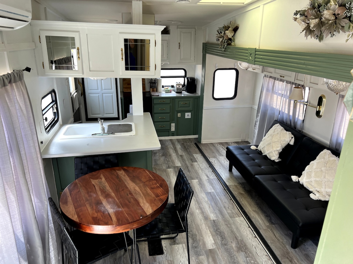 這是一個較舊的第五輪,非常適合那些尋找基本、乾淨且經濟實惠的住宿的人。 它不奢華,但配備了必需品:一張標準雙人牀墊、一張可轉換成牀的沙發、簡單的廚房、浴室,以及可供2人入住的舒適睡眠安排。 房源保持涼爽,配有迷你分離系統,讓您感到舒適。 請注意,這是一輛約25英尺的小型露營車。
