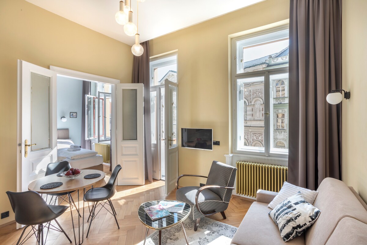 A new, luxury, one bedroom apartment in recently renovated historical building in the old center of Prague. The apt. has very modern interior combined with classic wooden elements. There's a quiet bedroom with double bed and a high quality mattress, a fully equipped kitchen, a comfortable living room with a sofa bed and a separate bathroom. Fast internet. The apt. is perfect for two but it comfortably hosts up to four guests. The building has 24/7 receptionist and security on duty.