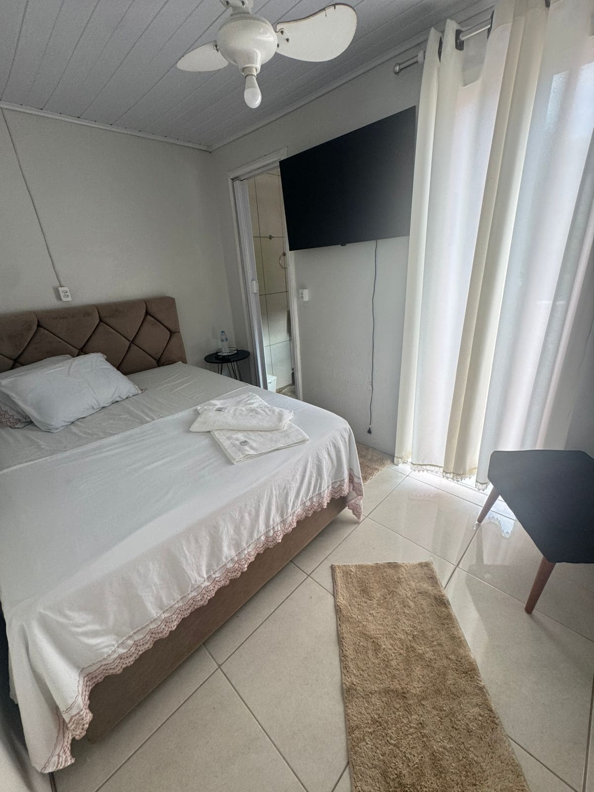 Casa com estilo, bem localizada para até quatro pessoas. 01 cama casal e a outra cama pode ser casal ou 02 de solteiro (separar) camas com capas protetoras que são higienizadas a cada troca de hóspede. Possui lençóis, travesseiros e fronhas, edredom, mantas, higienizados a cada troca de hóspede Pode solicitar troca das camas e toalhas, com custo adicional, consultar. Ar-condicionado nos dois quartos. Muito segura . Acesso à propriedade monitorado por câmeras Uma vaga de garagem monitorada