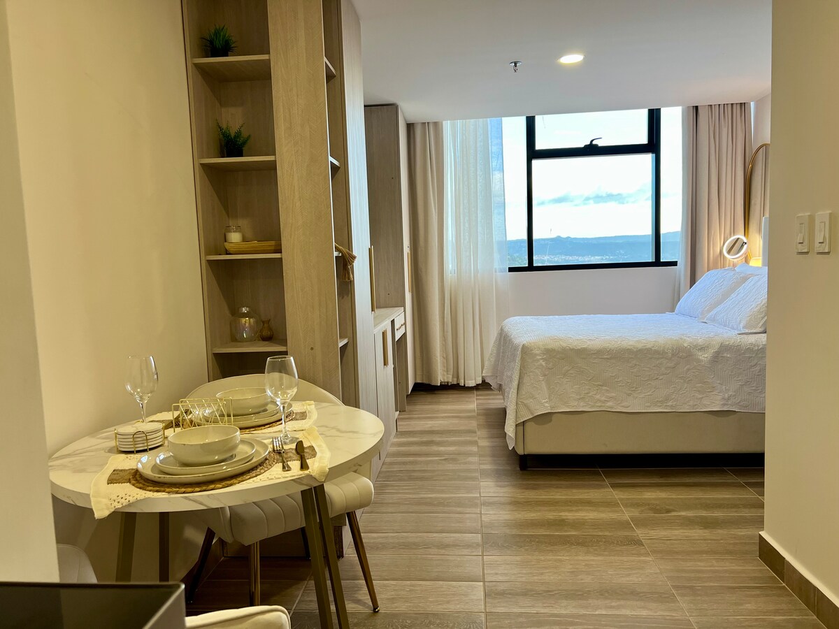 Disfruta de una estadía cómoda, tranquila y funcional en este moderno estudio tipo Executive Stay, diseñado para brindar el equilibrio perfecto entre trabajo y descanso en el corazón de la ciudad. Incluye una acogedora zona de descanso, estación de trabajo ideal para home office, cocineta totalmente equipada y un baño moderno. Su ubicación privilegiada facilita el acceso a zonas corporativas, educativas y comerciales, convirtiéndolo en una opción perfecta para estancias cortas y prolongadas.