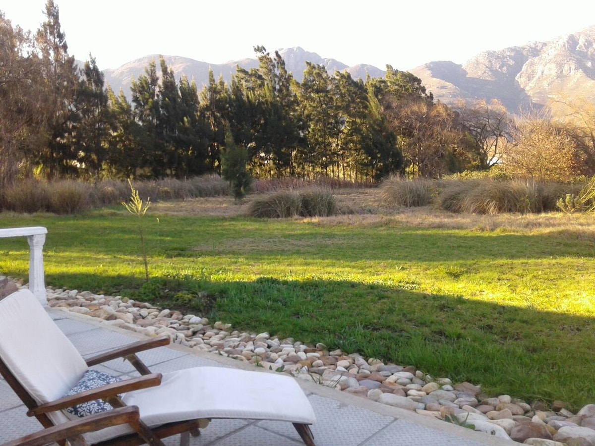 Hanepoot Cottage is close to Franschhoek village. You’ll love the cottage because of the spacious, private, setting on a working wine and fruit farm nestled against the mountains of Franschhoek Valley. Good for couples, solo adventurers, business travelers, and families (with kids). You are welcome to explore the farm and even practice your chipping and putting skills on the green.There is an inverter to provide electricity during loadshedding periods.