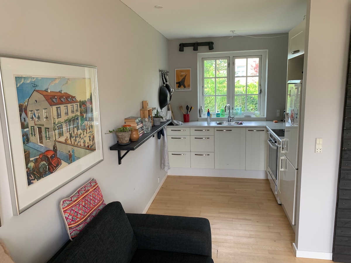 53平方公尺的舒適獨立客用住房。靠近路易斯安那州、克隆堡和弗雷德裏克斯堡城堡。步行即可抵達森林和海灘。 步行5分鐘即可抵達海岸線,乘火車前往哥本哈根市中心僅需35分鐘。