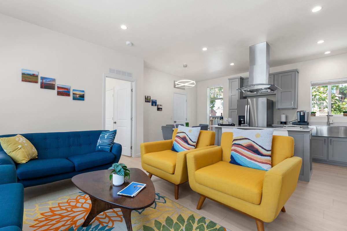 Enjoy a stylish experience at this centrally-located brand new home. Mission Peak view from the living room and kitchen. Fremont Bart, Kaiser & Washington hospitals, Central Park, Vargas Plateau hikes, Trader Joes, Wholefoods, charming historic Niles district are all within a 2-mile radius. The home is furnished with a mid-century modern vibe that colorful and classy. The 9 foot high ceilings give it an airy and spacious feel. Free parking for 1 car on the property and free street parking.