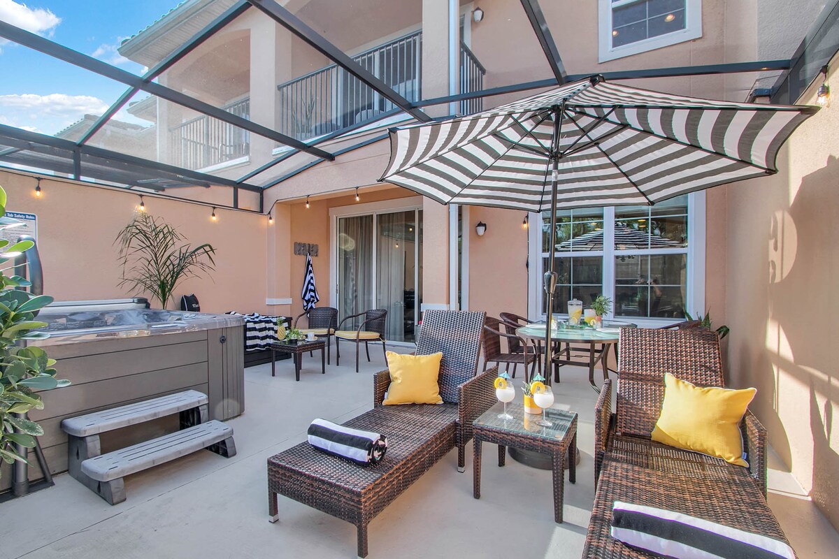 Come get away to our modern, super-clean, self-contained garden oasis town house in the Regal Oaks Resort - close to grocery stores and take out food - minutes walk from Old Town Kissimmee and a short drive from Disney's ESPN - World of Sports and Town Center Celebration. We are 15 minutes drive from Epic - Universal and Disney parks. Our private screened in hot tub is the perfect place to relax in the Florida sun or under our sun shade.