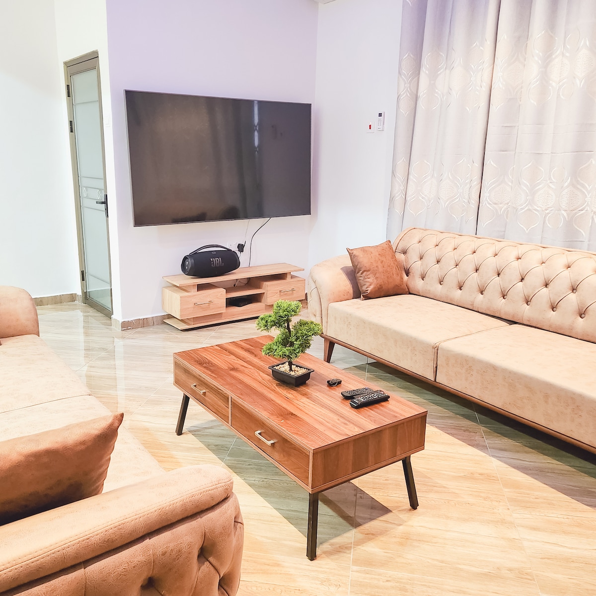 Welcome to Cozy Minimalist Apartment, just 20 minutes from the airport! Enjoy a fully equipped living room and kitchen, perfect for families, couples, friends, and solo travelers. Nearby attractions include Achimota Zoo, the Golf Center, and Achimota mall. Grocery stores and dining options are a short stroll away. Stay connected with reliable WiFi and enjoy Amazon Prime, Netflix, and cable channels.