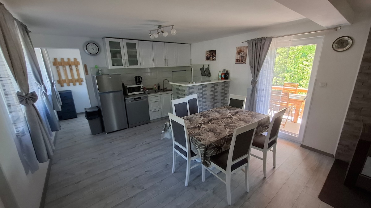 擁有2間公寓的房子,位於島上, 180平方公尺,有2個大露臺,配有花園燒烤和休息區域。 這是與家人或朋友一起度假的好去處。 被大自然包圍,室外舒適,室內裝潢舒適。 它設備精良,但仍然現代化和和諧,位於市區的一個安靜區域。 -距離普利特維採湖國家公園60公裏, -距離Gacka河3公裏, -距離Kuterevo Young Bear Sanctuary 20公裏, -距離飛索Medo 20公裏, -距離Senj City的亞得裏亞海45公裏。